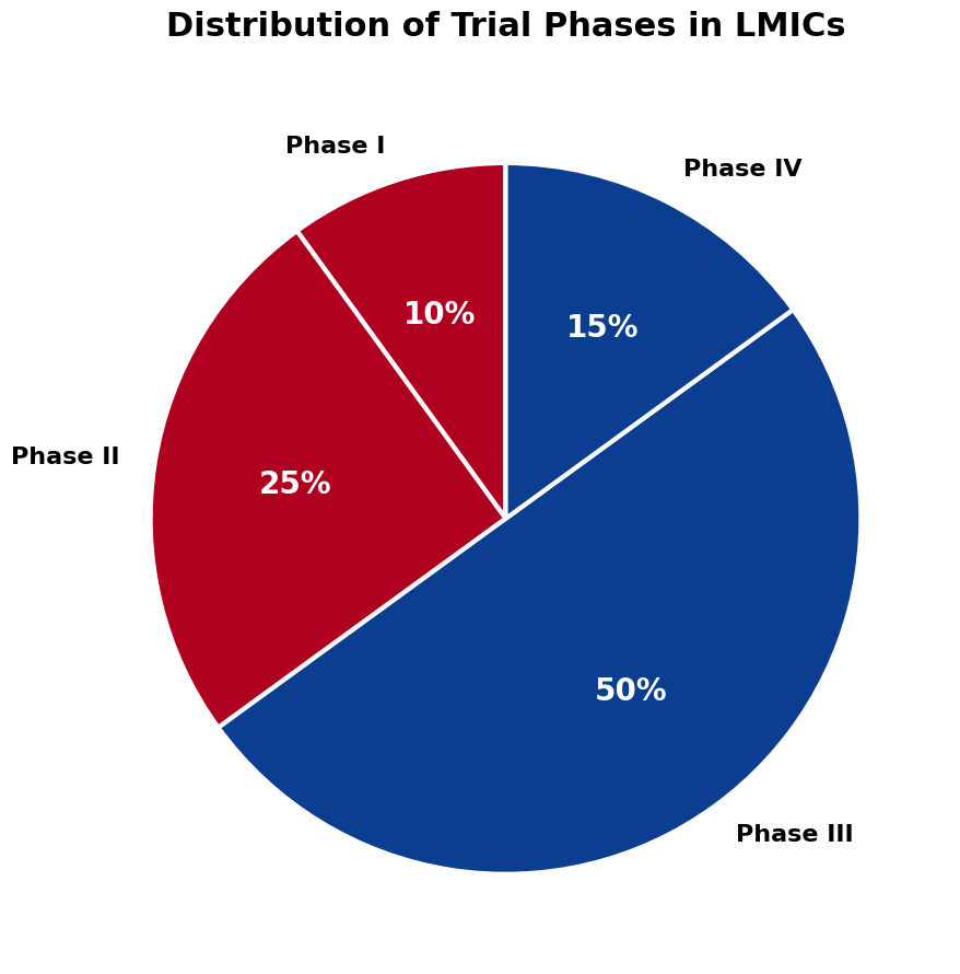 As shown in the chart below, most trials conducted in low- and middle-income countries fall within Phase III. Early-stage research remains limited in these regions, restricting scientific participation and capacity development.